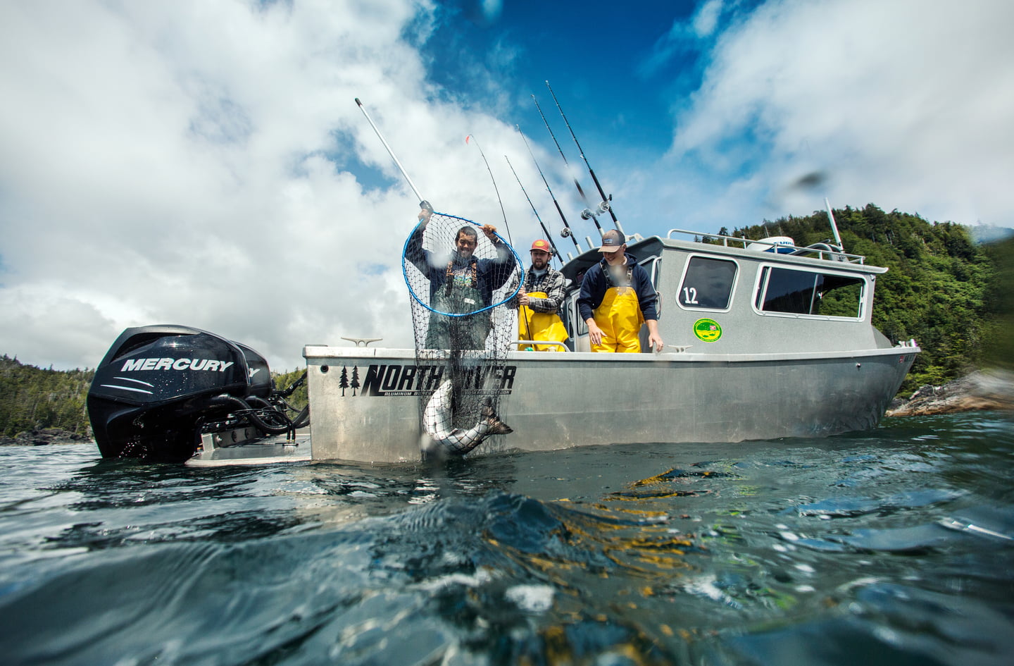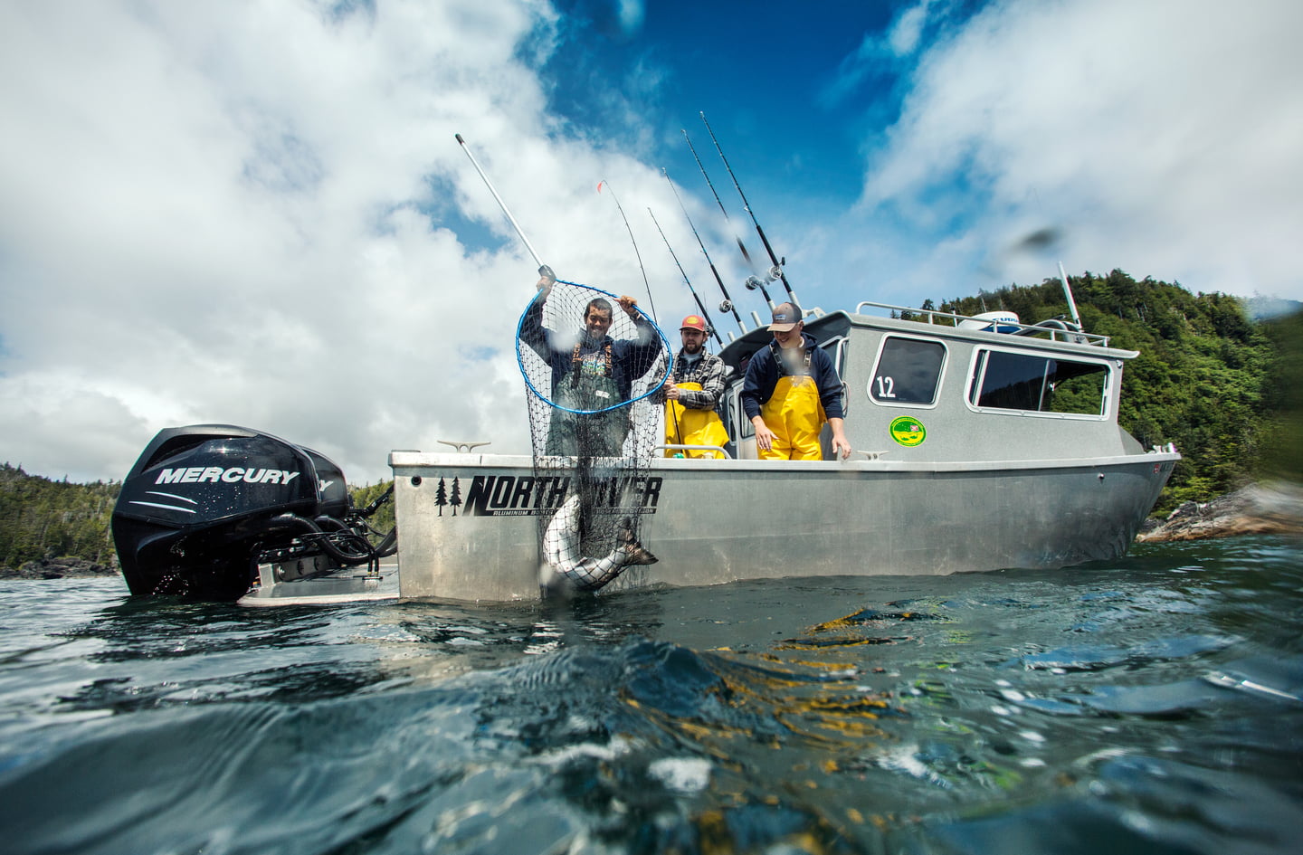 Keep reeling fast as long as you can feel the fish on there. Salmon fight by swimming hard and rapid, often around and under the boat. The guide will help you navigate the boat around other guests' lines.
